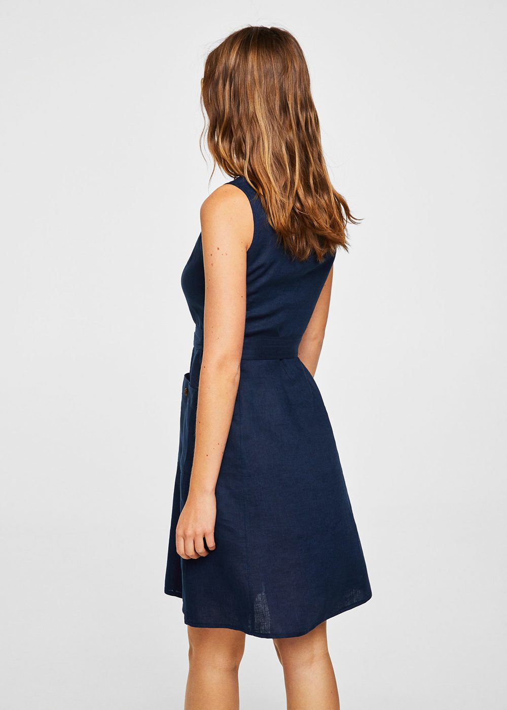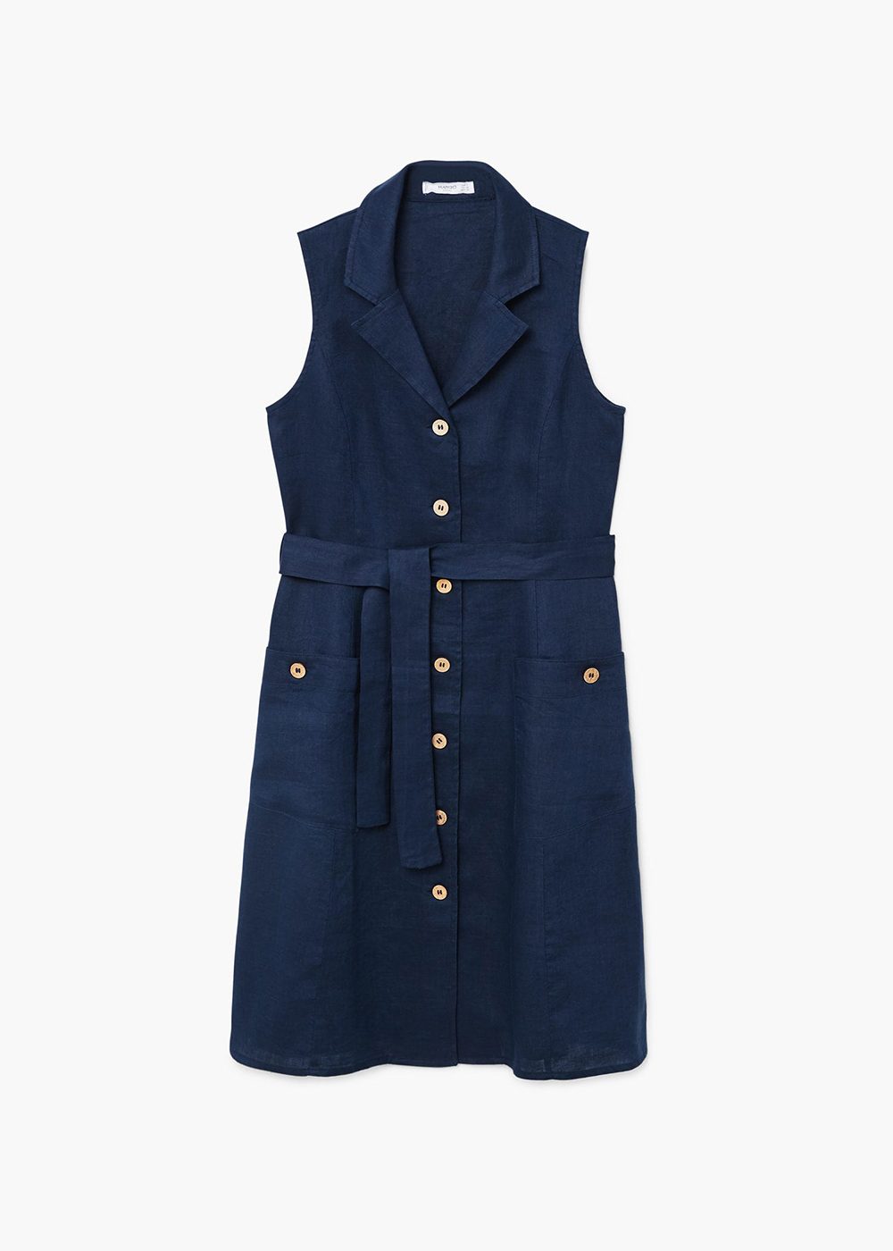 Linen and cotton mix. Straight design. Classic collar. Sleeveless. Removable belt at the waist. Two patch pockets on the front. Button fastening on the front section.